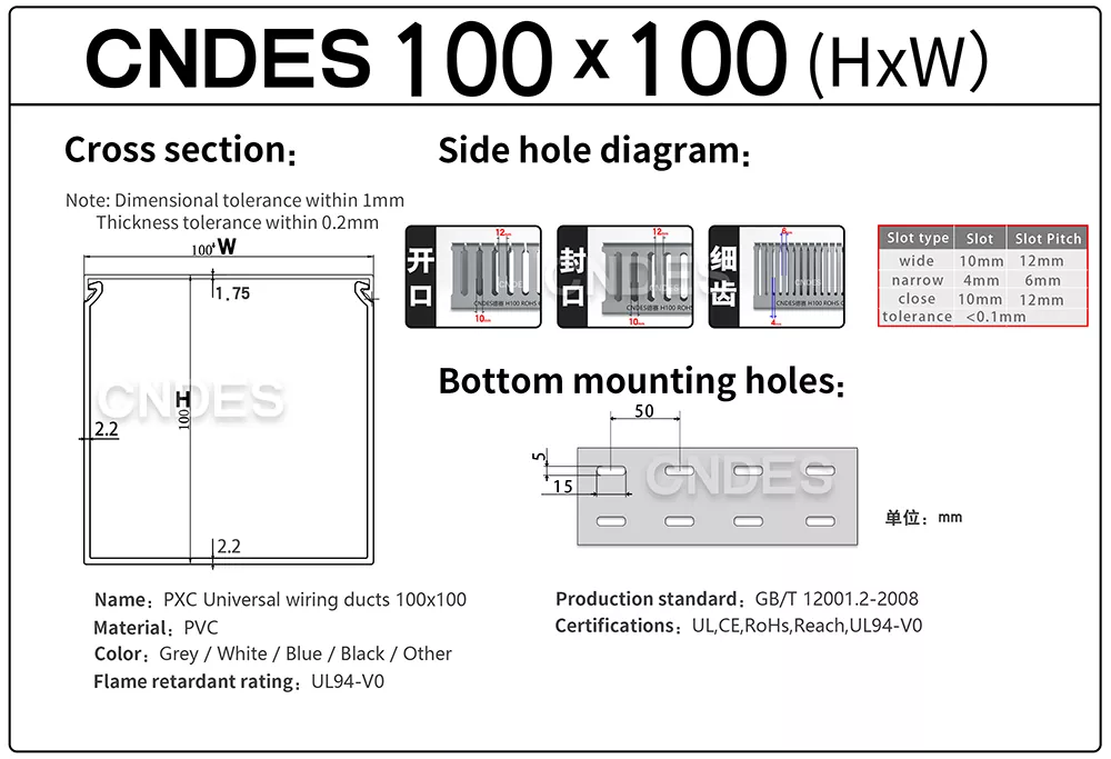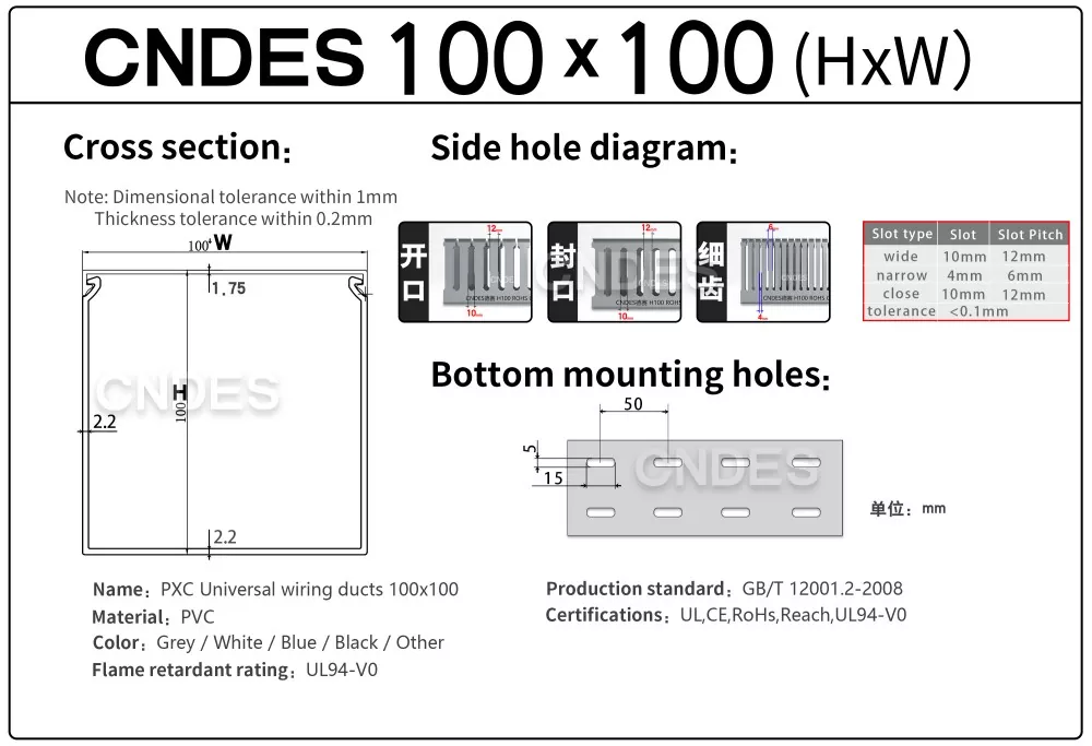 Оптимизирајте ги вашите проекти за кабли со нашите прилагодени кабли за управување со жици 100×100. Како водечки производител и добавувач на кабли за ПВЦ кабли во Кина, CNDES обезбедува сигурни, високопрецизни и приспособливи решенија за сите ваши потреби за управување со кабли. Ги имаме сите спецификации за жичани канали (послужавници за кабли). Ако ви требаат други спецификации, ве молиме слободно контактирајте со нас!