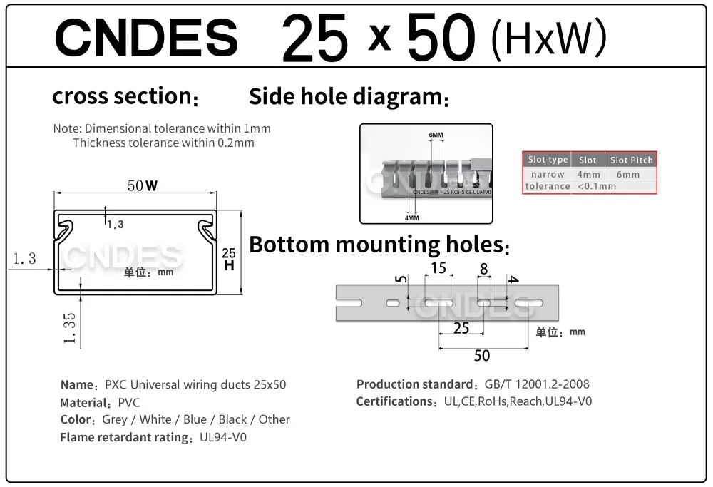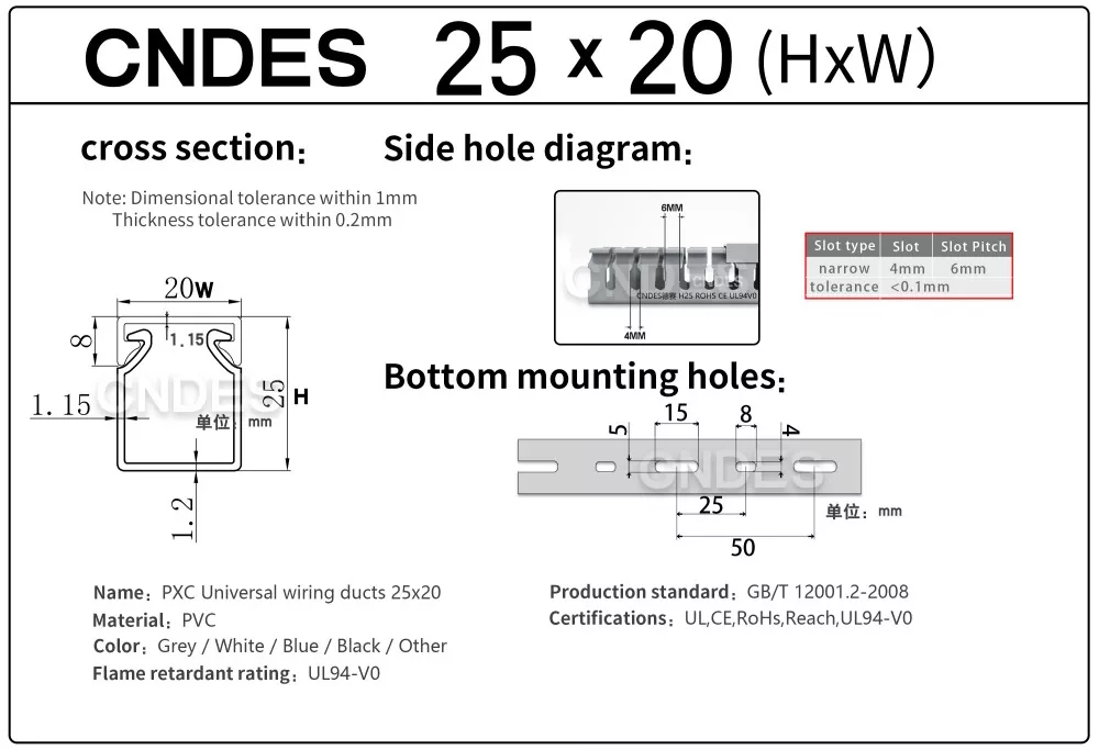 Преку нашата независно развиена опрема за печат со висока прецизност, комбинирана со уникатен сегментиран процес на автоматско сечење, CNDES може флексибилно да произведува производи во повеќе спецификации, вклучително и ПВЦ канали за контролна табла со дупчиња со високи перформанси од 25 mm, задоволувајќи ги различните потреби на клиентите во контролните кабинети и електричните системи.