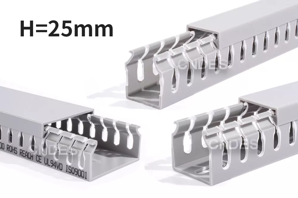 Овој производ е ПВЦ канал за жици со дупчиња со мала висина, дизајниран да ги организира, штити и води електричните кабли во контролните панели. Висината од 25 мм овозможува да се инсталира: