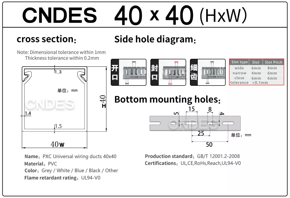 Можете да бидете сигурни дека ќе купите квалитетен ПВЦ канал за ожичување со капак од 40×40 од нашата фабрика (CNDES). 40мм висина и 40мм ширина.
