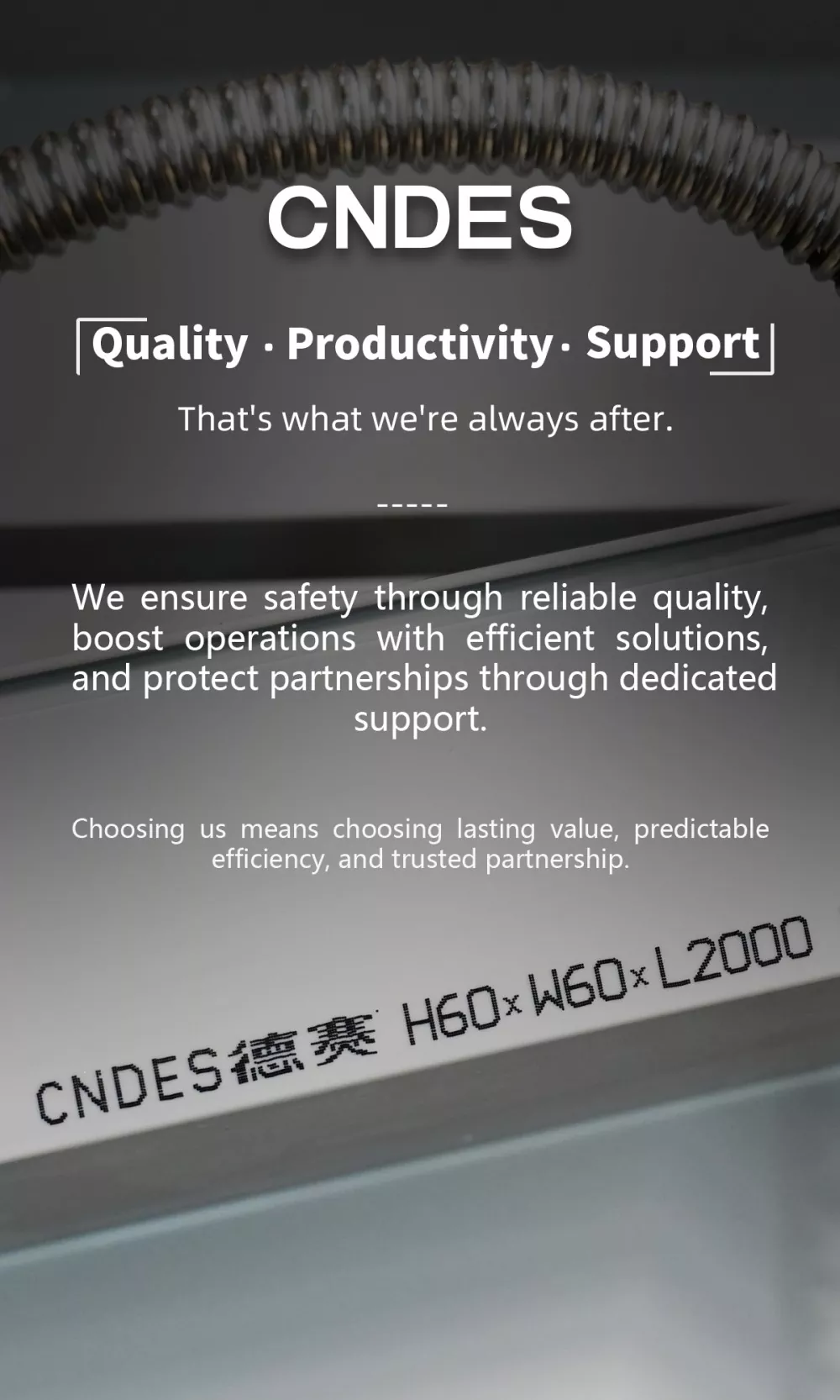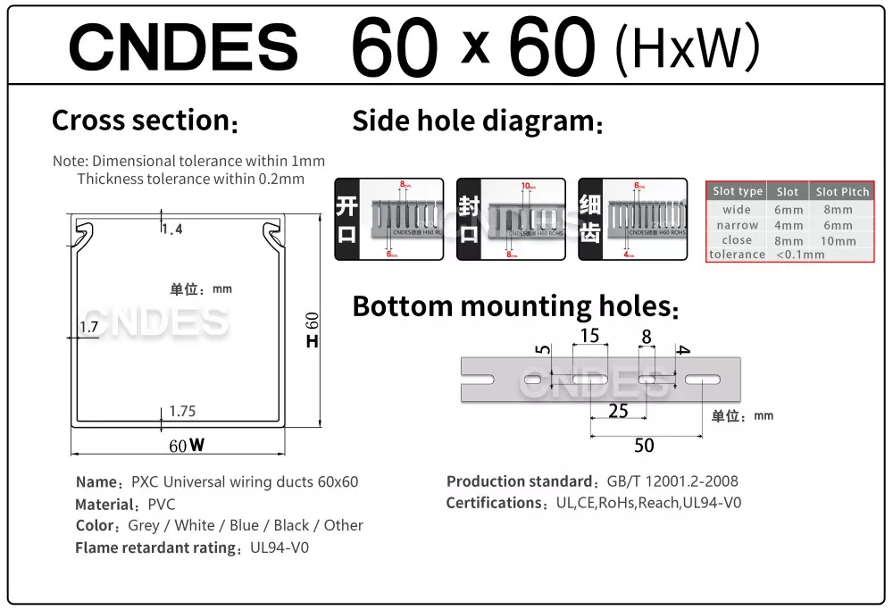 Кабелот за кабли за контролен кабинет на CNDES е направен од сопствена ПВЦ формула. Каналот за контролен кабинет со дупчиња ПВЦ е еколошки, отпорен на пламен и отпорен на удари и може да издржи постојано свиткување од 180° без да се скрши.