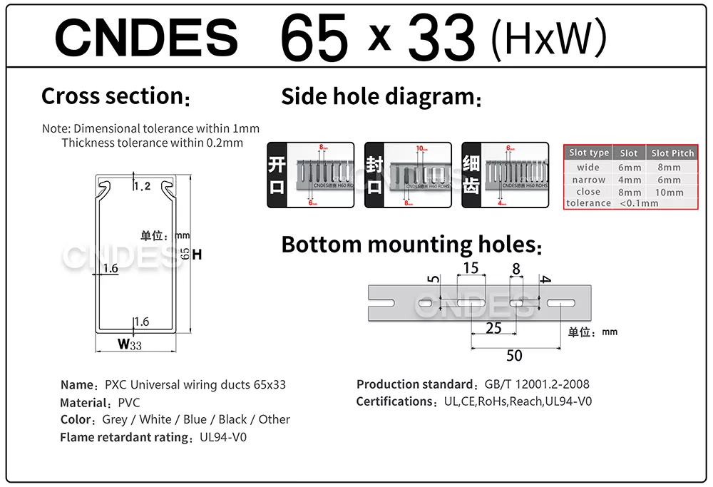 Во CNDES, дизајниравме квалитетен канал за насочување на кабли 65×33 специјално за проекти каде што просторот е ограничен, но организацијата на кабелот сè уште е важна. Овој компактен канал за насочување им помага на инсталатерите да ги одржуваат жиците уредни, заштитени и лесни за управување во електричните панели, контролните кутии и компактните куќишта.