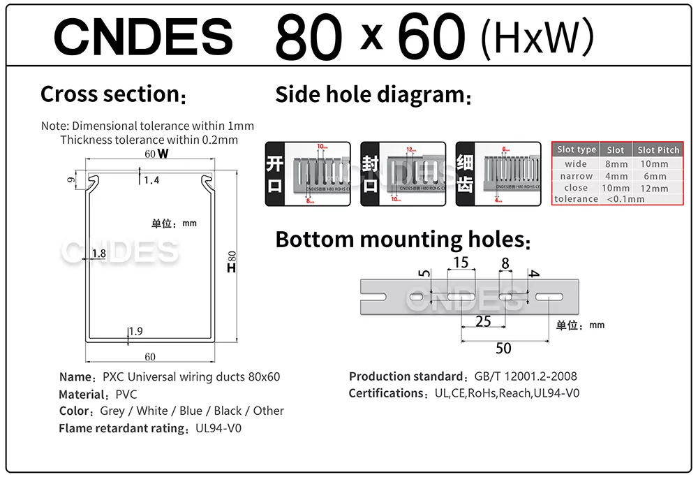 4. Нашиот UL 80×60 наведен ПВЦ канал за жици со дупчиња целосно се усогласува со стандардите за сертификација UL, CE, RoHS и REACH, што го прави идеален за проекти ширум светот.
