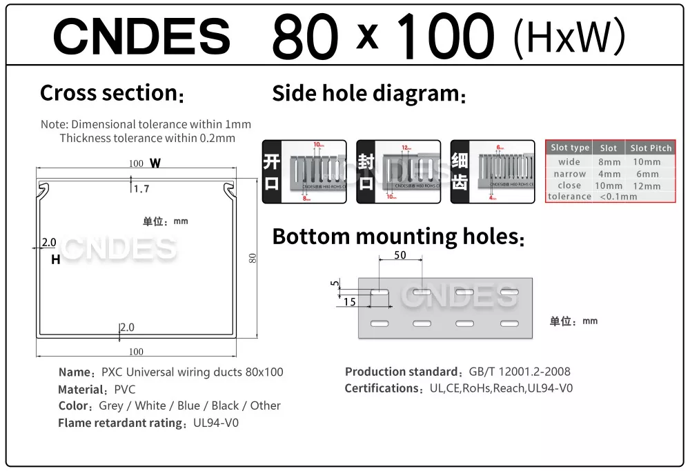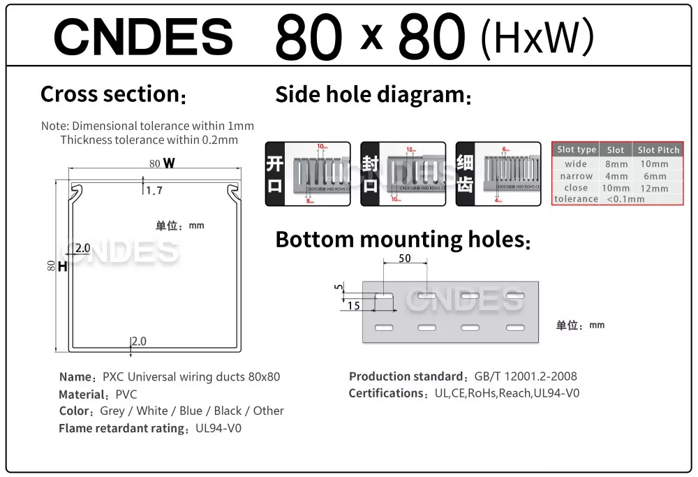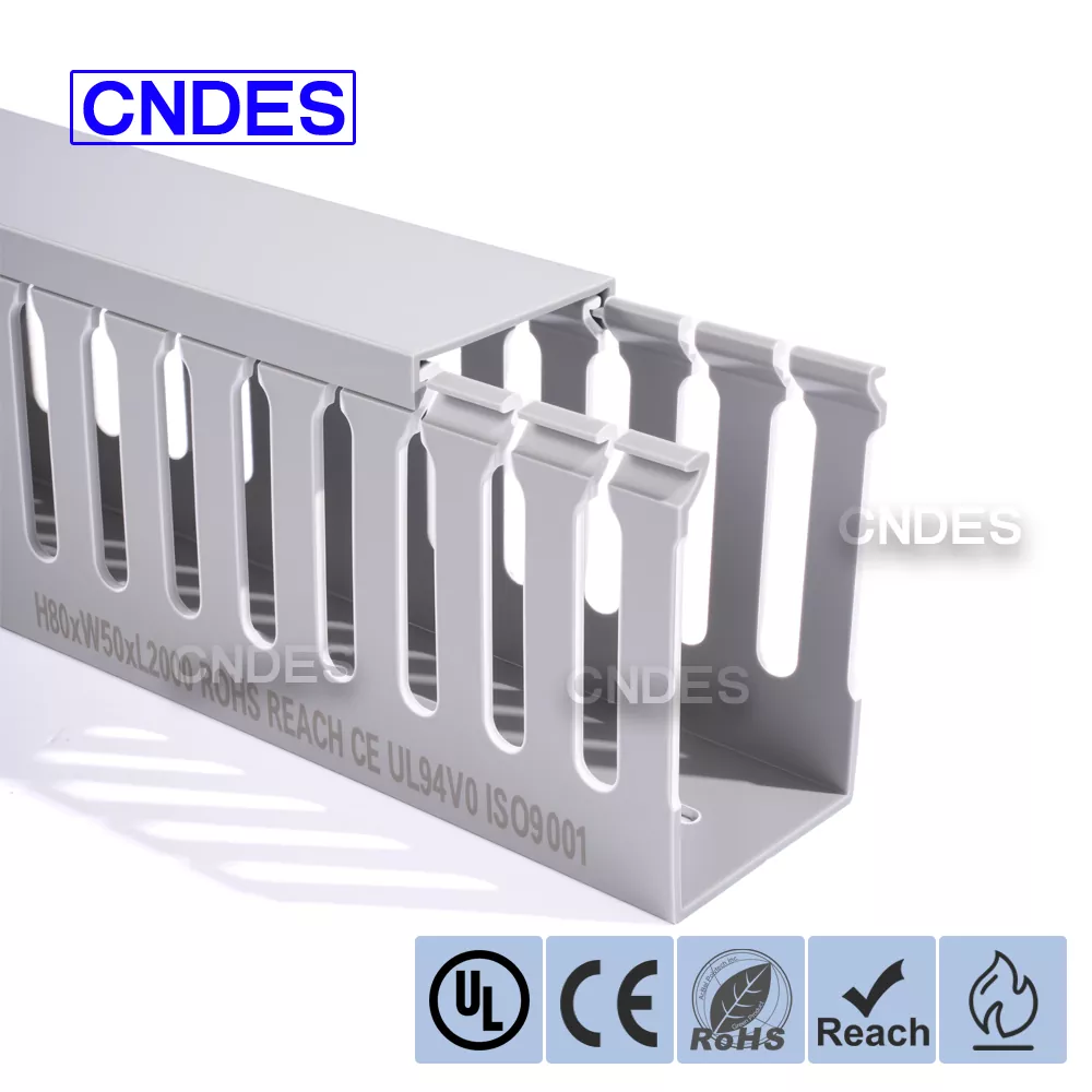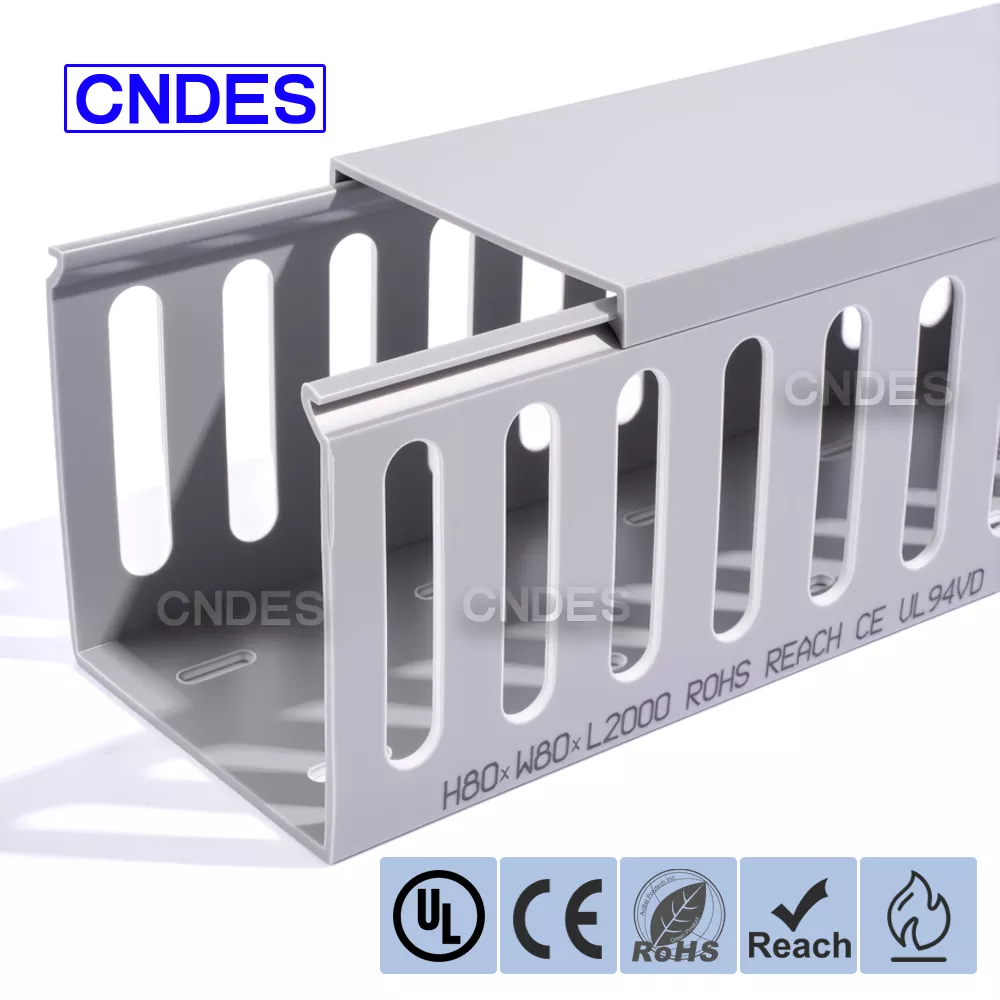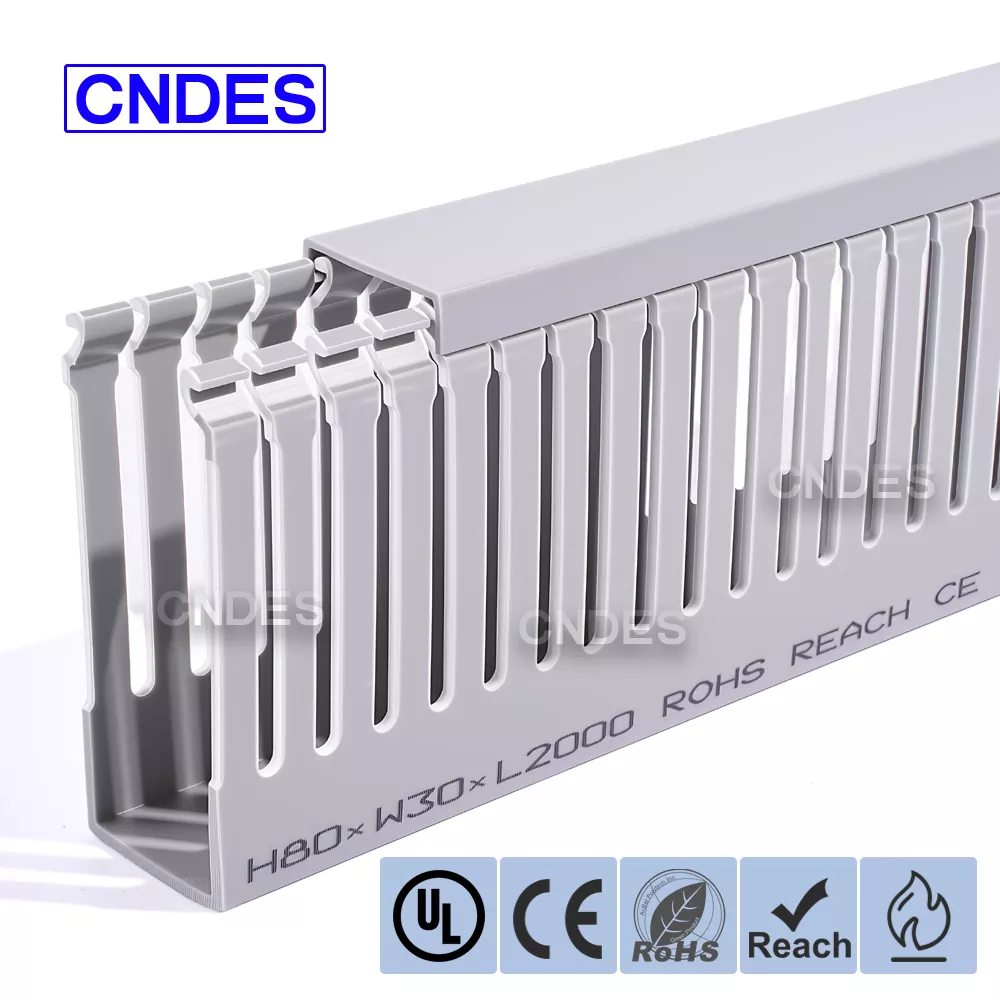 Прилагодениот кабелски канал за автоматизација на PVC со 80 дупчиња од CNDES е дизајниран за ефикасно управување со кабли во системи за индустриска автоматизација. Со својата висина од 80 mm и дизајн со дупчиња, овој канал обезбедува доволно простор за жици со висока густина додека ги одржува каблите организирани и заштитени во сложени контролни системи, PLC и апликации за поврзување на машините.