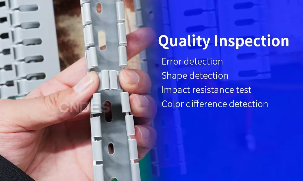 Инспекцијата за квалитет со висок стандард е од суштинско значење за обезбедување на добри производи. Во CNDES, нашата потрага по квалитет е бесконечна. Не штедиме напор да им обезбедиме на нашите клиенти сигурни производи. Имаме четворица инспектори за квалитет кои работат во смени за да вршат онлајн инспекции на нашите производи. Ова осигурува дека нашите квалитетни ПВЦ автоматизирани кабелски канали со 80 височини имаат квадратна форма, имаат мазни површини и ги исполнуваат прифатливите стандарди за цврстина,